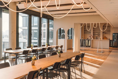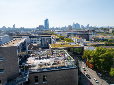 Modern event venue with a view of the Frankfurt skyline and an exclusive 262 sqm rooftop terrace