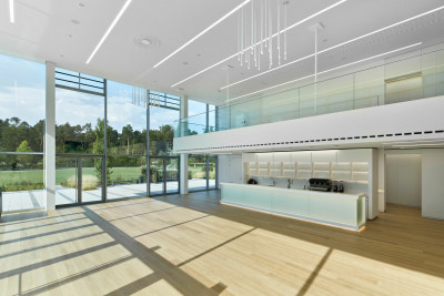 Modern, glazed building on a vineyard