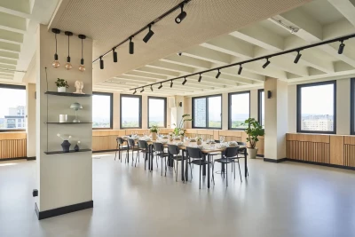Modern, fully equipped event room with roof terrace. Perfect for catering such as high-quality menus, flying finger food, hot buffets, cold buffets, coffee & cake, wines, cocktails and more