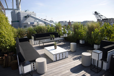 Moderne Eventlocation mit Blick auf die Frankfurter Skyline und exklusiver 262qm Dachterrasse