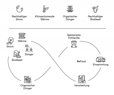 ReFood ist ein innovatives Entsorgungsunternehmen, welches ausschließlich organische Materialien, die in der Lebensmittelkette oder beim Verbraucher keine Verwendung mehr finden, verwertet. Aufgrund ihrer energetischen Anteile an Kohlenhydraten, Zucker und Fett sind solche Reststoffe kein Abfall, sondern wertvolle Rohstoffe. Diese Lebensmittelreste werden ansonsten über den Restmüll verbrannt . So würde sehr viel wertvolle Energie verschwendet, die stattdessen durch ReFood in umweltfreundliche Energie verwandelt wird.