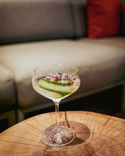 Auch das Mobiliar war Teil des Gesamtkonzepts. Baumstämme wurden zu Tischen, massive Holzplatten dienten als rustikale Stehtischflächen, ergänzt durch moosgrüne Sofas und natürliche Materialien.